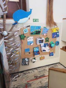 Os alunos do 5º ano desenvolveram outras tarefas: participaram na elaboração de um separador de livro nas aulas de TIC. Nas turmas do 5ºD e 5ºE, esta atividade realizou-se em articulação com a disciplina de Português e com o Clube Poetas Vivos, tendo os alunos elaborado poemas sobre o tema “Água” que, posteriormente, incluíram no marcador. Na disciplina de MART desenvolveram um projeto de programação, na plataforma UBBO, com base na revista mensal do Oceanário de Lisboa na qual foi lançado o desafio “O Bodião-Limpador”. A participação neste desafio permitiu, por um lado, abordar temáticas da disciplina de Ciências Naturais e, por outro, refletir na/divulgar a mensagem a ele associada e que visa os alunos se tornarem eles próprios “bodiões-limpadores”.